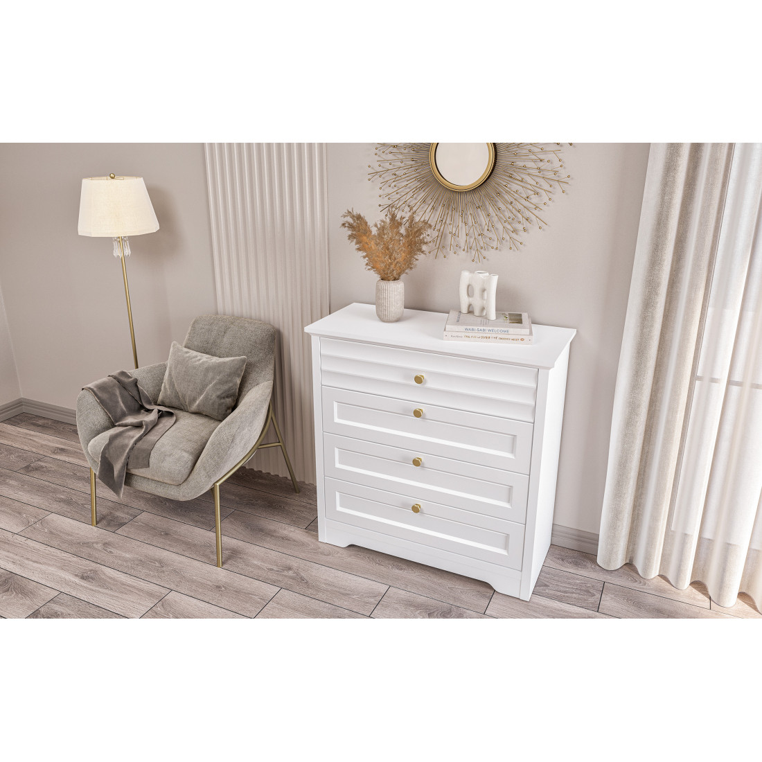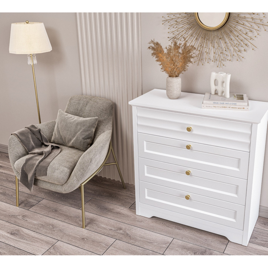 Денвер – это новая коллекция корпусной мебели для спальни, гостиной и столовой. Прямые строгие линии в сочетании с легкой горизонтальной волной на фасадах придают мебели элегантный и уверенный вид. Белый матовый цвет мебели, любимый многими за универсальность, можно сочетать с любым оттенком стен и пола. Округлые металлические золотые ручки разбавляют строгий и лаконичный вид фасадов и добавляют интерьеру утонченности.