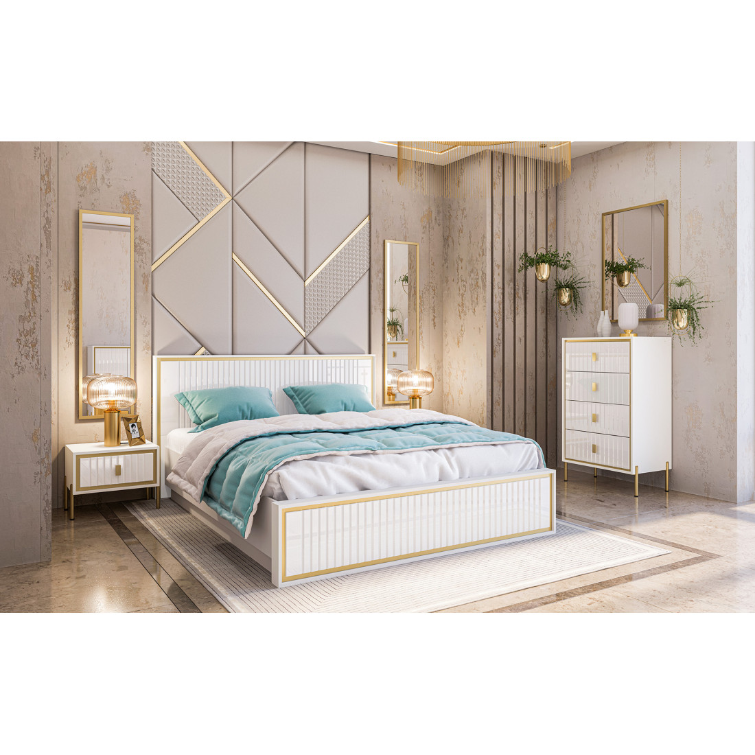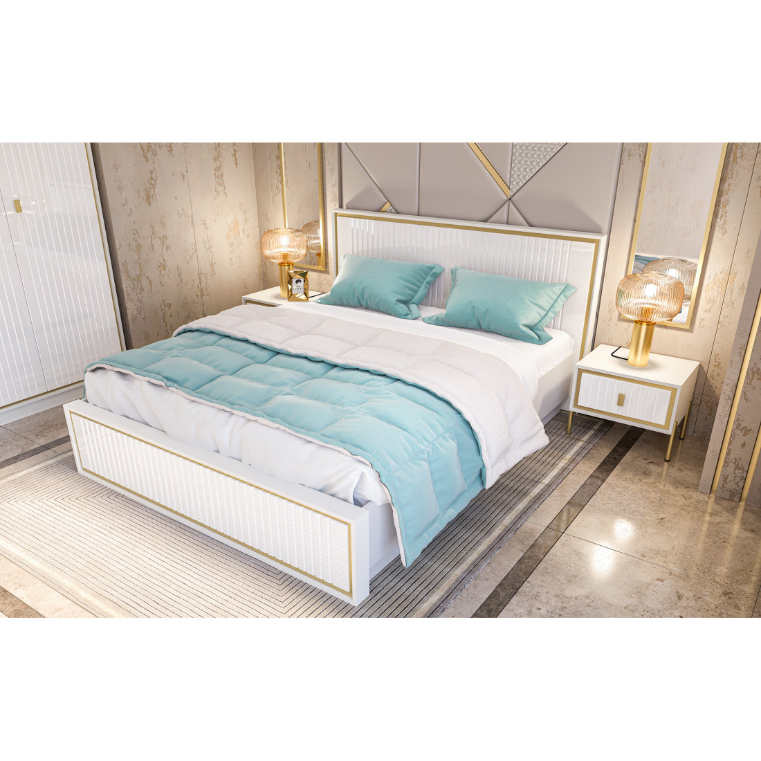 Белоснежная кровать из МДФ в цвете белый глянец. Изголовье кровати украшено золотистой каймой и рефленной фрезеровкой.