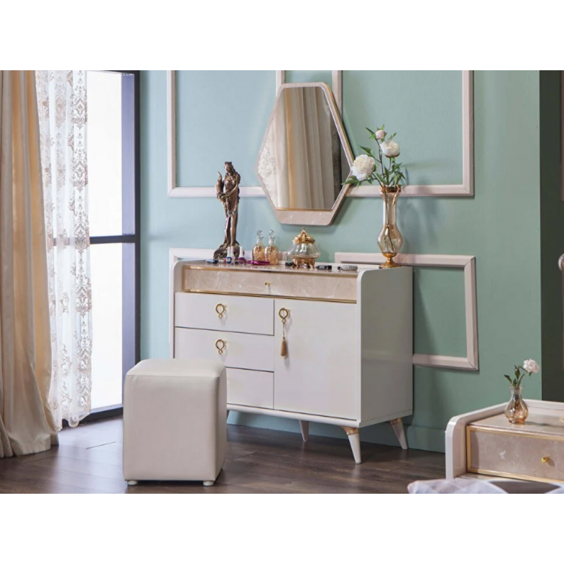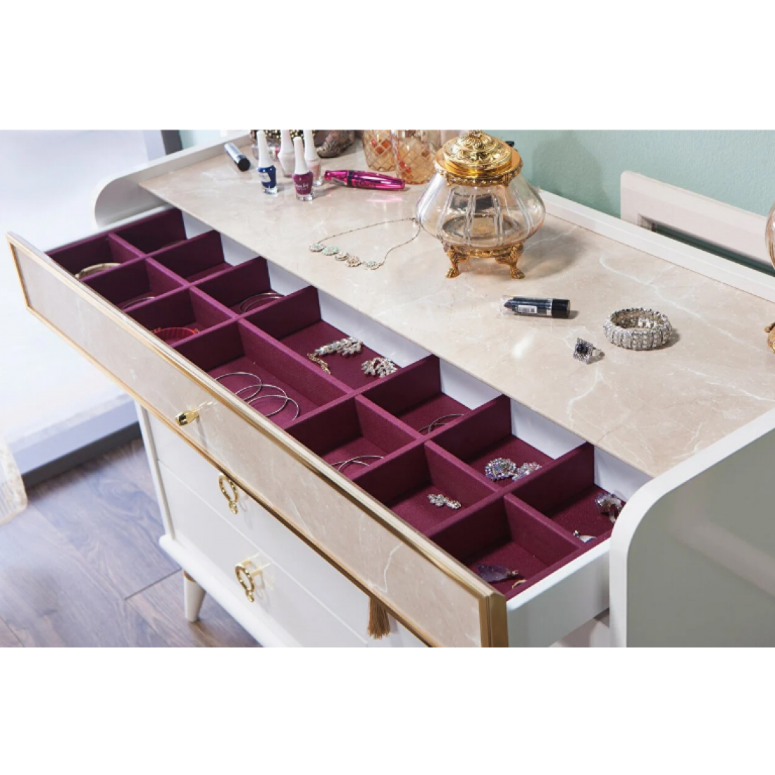 Комод- туалетный столик Monreal дополнит вашу спальню. В вернем ящике- разделитель отделанный тканью для украшений (можно не ставить), за дверцами- деревянная полка. Серия снята с производства.