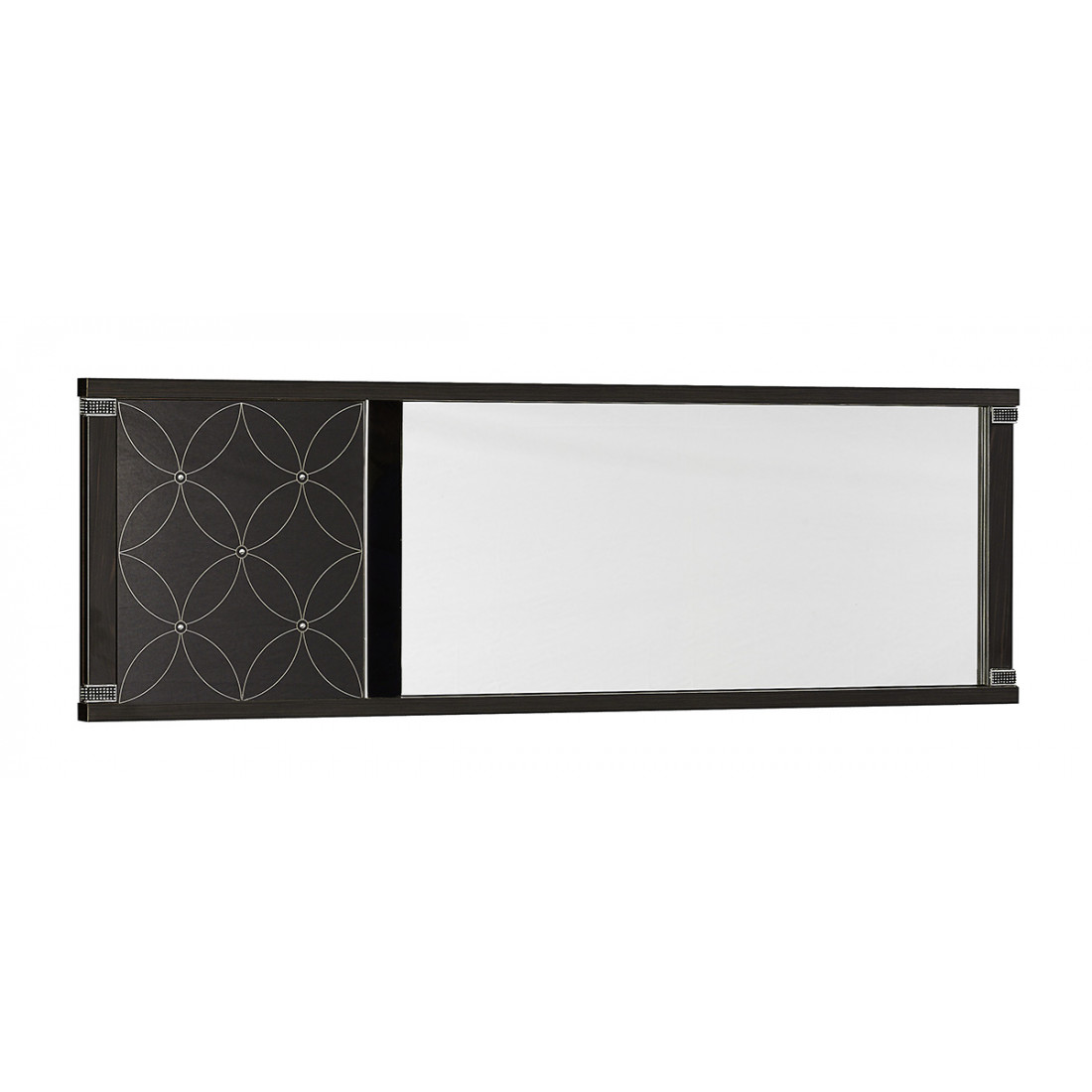 Прямоугольное настенное зеркало MIRA-10 (венге) серии Мира от Беллона наделено интересным эффектным дизайном. Помимо удлиненного зеркального полотна, в раме расположена вставка из черного каленого стекла с характерным для коллекции эффектным орнаментом, украшенным стразами . Купить настенное зеркало можно отдельно, рекомендуем в комплекте с удлиненным комодом серии Мира.