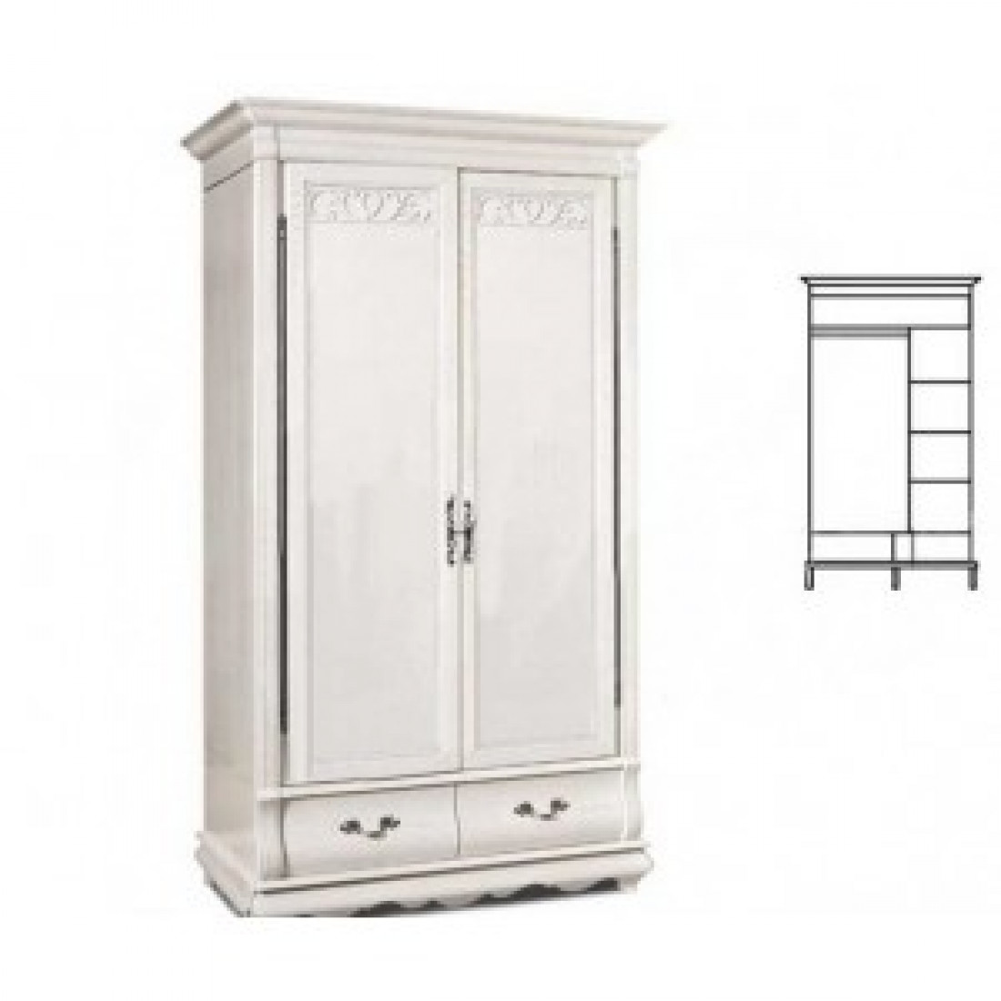 Массивный двухдверный шкаф для спальни из коллекции "Оскар" органично впишется в интерьер в классическом стиле. Высокие карнизы и романтичный резной узор придают модели изящества. Выдвижные бельевые ящики на направляющих. Фасад выполнен из массива дуба, модель окрашена в оттенок "Белая эмаль с патиной".