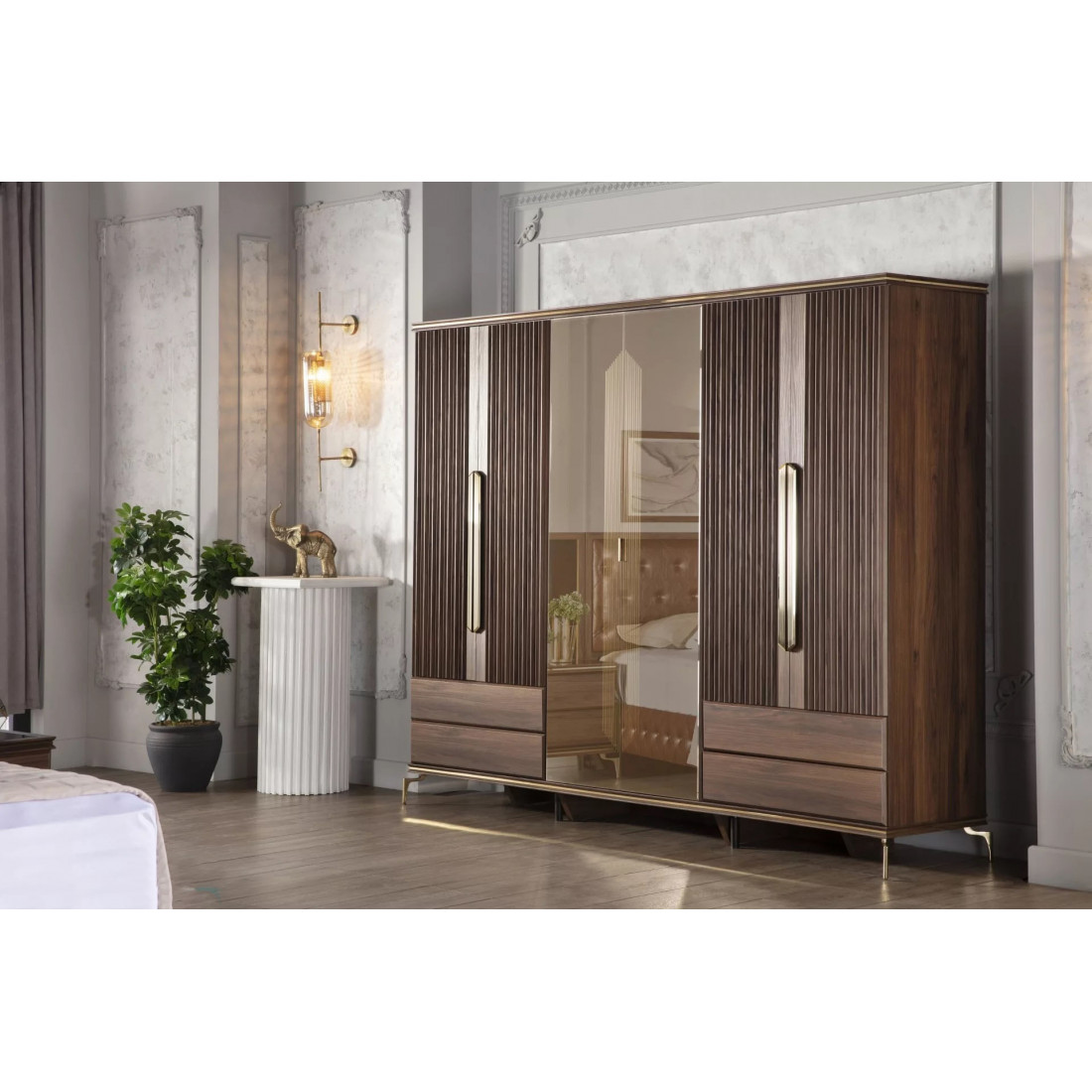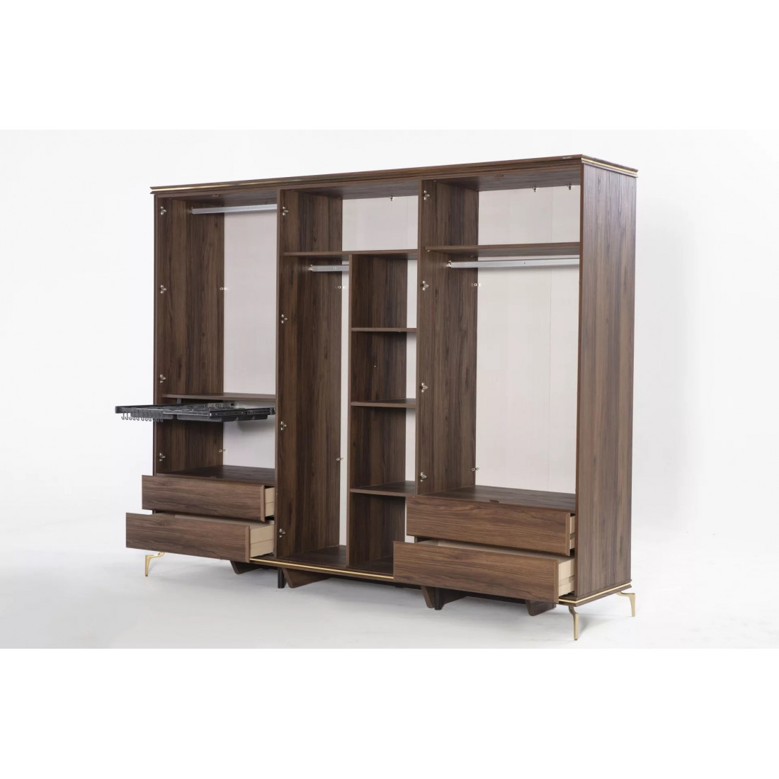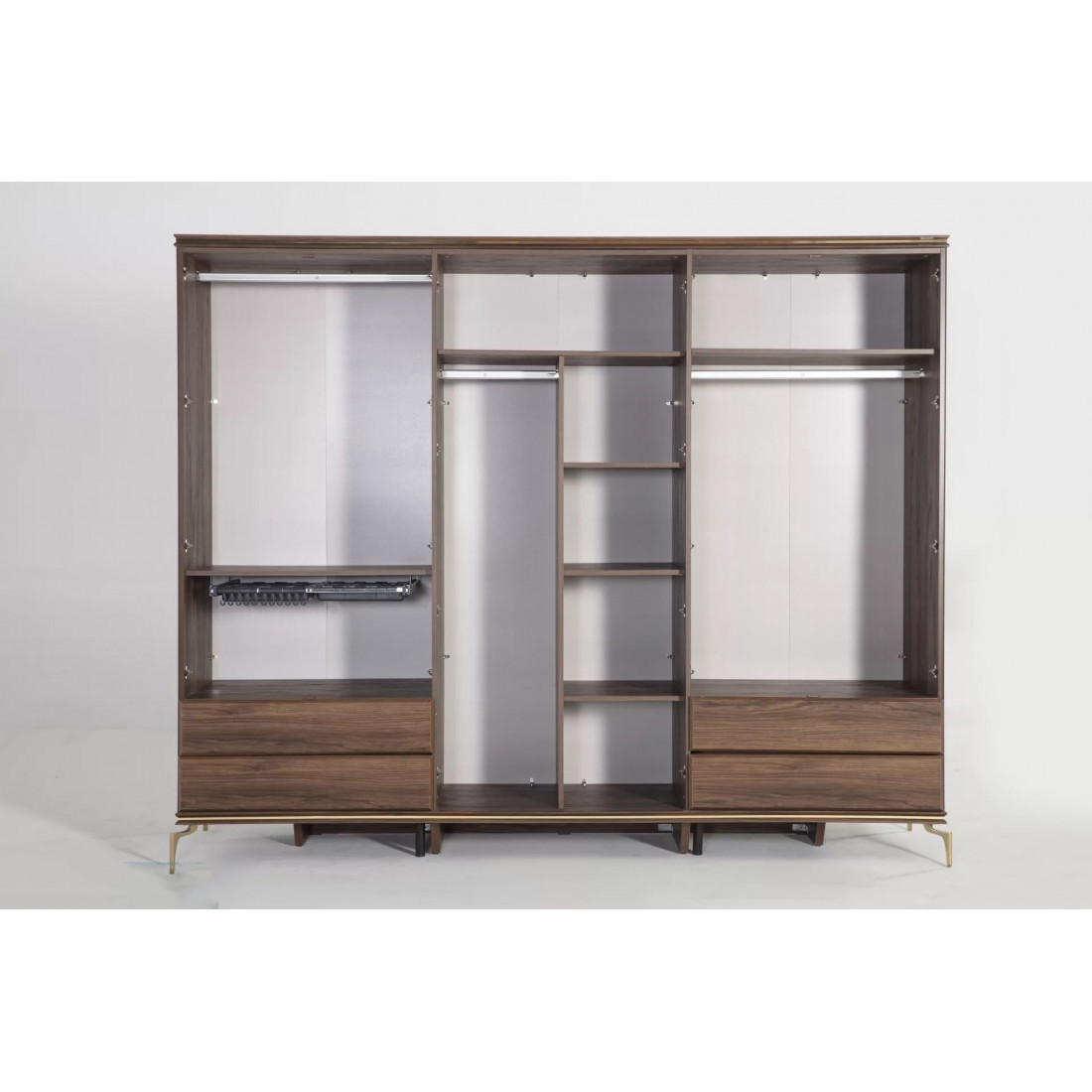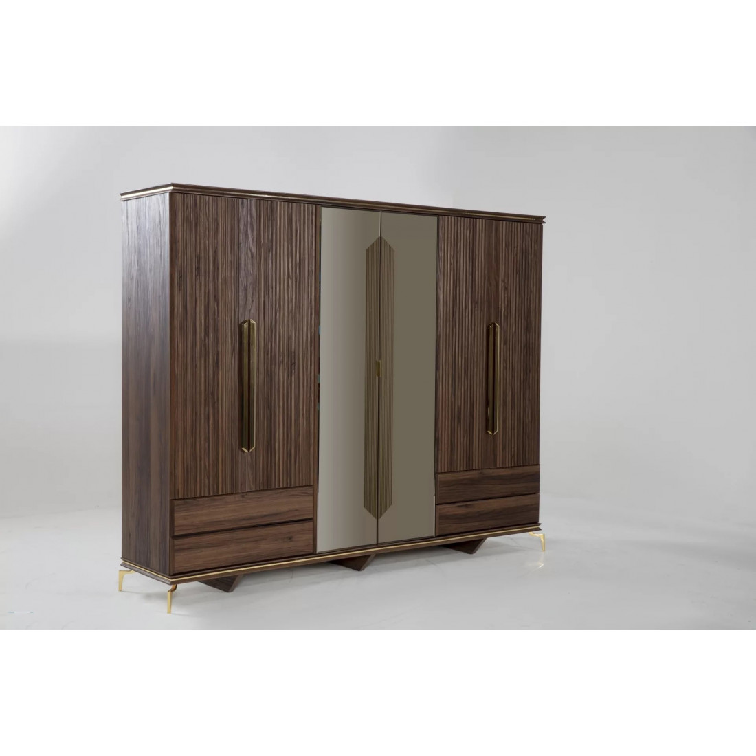 В цветовой конфигурации спальни "Montego" были предпочтительны цвета из черного мрамора с темным орехом. Специально разработанные для коллекции металлические ручки и ножки выполнены в ярко-золотом цвете, чтобы соответствовать стилю. Благодаря применению профиля в треугольной структуре, расположенной по всей системе, было получено визуальное богатство.