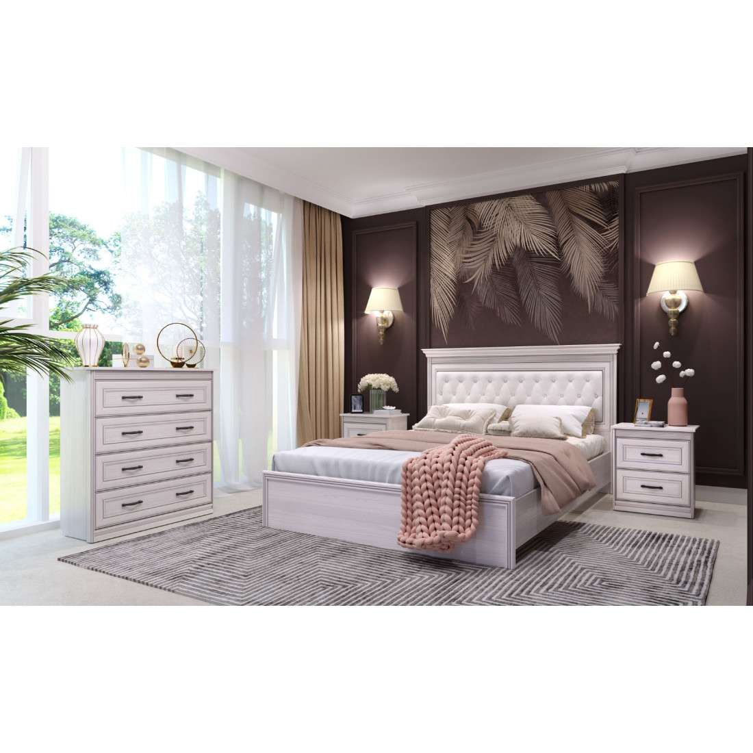 оллекция включает разнообразые модули – шкафы, комоды и комодино, кровати трех размеров с ортопедическим основанием или подъемным механизмом. Мебель комплектуется надежной крепежной фурнитурой. Украшением фасадов служат изящные металлические ручки цвета «античная бронза» .